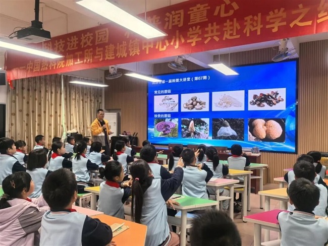活动伊始,“科技入课堂”环节精彩开讲。云浮市科普讲师团成员、农村科技特派员、 中国热科院加工所副研究员刘义军博士以《识“菇”辨“蘑”,吃出智慧好身体》为题,通过介绍食用菌的“真菌”特性、餐桌上的常见蘑菇、蘑菇食用安全知识及健康食用方法,让同学们在趣味讲解中学会科学识菇、安全吃菇。