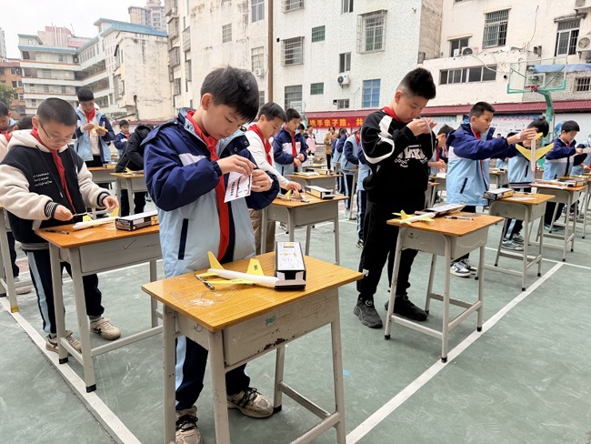 上午的现场竞赛环节亮点纷呈,成为检验学生科学实践能力的生动赛场。一二年级学生化身“小小飞机设计师”,用A4纸演绎创意纸飞机;三四年级“王牌飞行员”操控手掷飞机精准落地,赢得阵阵欢呼;五六年级橡筋动力飞机比赛更是将氛围推向高潮,当飞机腾空而起,全场师生屏息凝神追踪其轨迹,降落时爆发出的热烈掌声,正是科学魅力最直观的体现。这种以赛促学的形式,让学生在比拼中深化对科学原理的理解,有效提升了科学探究能力。