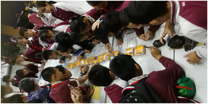 活动以现场陨石样本展示、科普知识展板、科普讲座等形式展开。活动深深地吸引了同学们眼球,他们争先恐后地观看陨石,用手触摸着来自宇宙的“星星”。陨石科普展板从宇宙到陨石再到陨石矿物,从碳质球粒陨石到生命起源,从太阳系起源到地球形成,较为详细介绍了相关知识要点,为学生们送去了一堂堂生动的科普课,让他们大开眼界,初步了解了陨石及其与人类的关系。活动现场还播放了相关视频,引发了同学们一阵阵惊呼和感叹。许多学生认真记录着科普展板和讲座内容,有的同学还即兴作画抒发对陨石带来的激情。