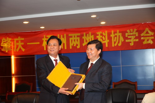 肇庆科协党组书记、主席孔进棠向梧州市科协主席李巧扬赠送纪念品.jpg