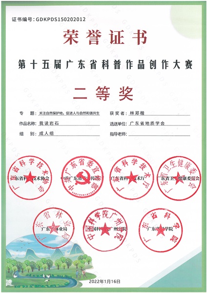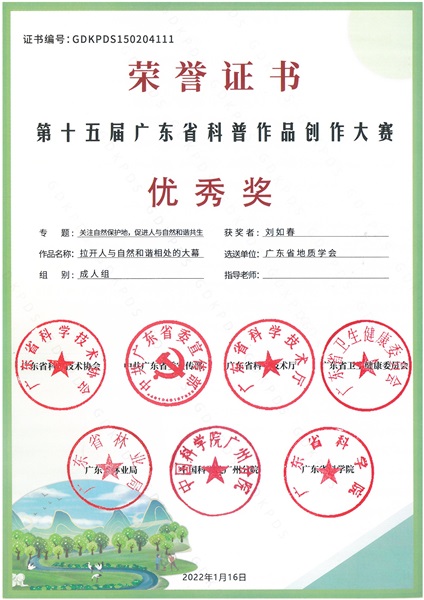 近日,省地质学会科普委专家创作的四件作品,斩获四个省级科普征文比赛大奖。在第十五届广东省科普作品创作大赛中,刘如春创作的科学组诗《诗赏南粤大美中医张忠德(二首)》和林郑楷创作的科学诗《我读岩石》双双荣获二等奖;刘如春撰写的另一篇长篇科学纪实散文《拉开人与自然和谐相处的大幕》获得优秀奖。此外,刘如春在参加2020年宁夏科普作品创作大赛中创作的科普组诗(五首)《抗疫院士英雄榜》亦荣获“典赞·传播奖”。