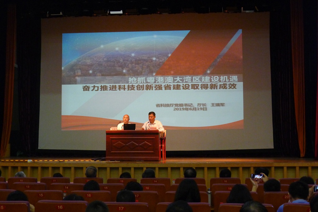 6月19日上午,省科协会同省科技厅在广东科学馆科学会堂举办“不忘初心、牢记使命”主题教育专题辅导第三场报告会。省科技厅党组书记、厅长王瑞军作《抢抓粤港澳大湾区建设机遇 奋力推进科技创新强省建设取得新成效》主题报告。省科协党组书记、专职副主席郑庆顺主持报告会。省科协和省科技厅领导班子成员、两个单位机关和直属单位全体党员(含离退休党员)400多人参加会议。