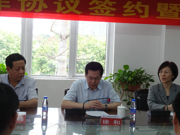 徐和常委代表潮州市委市政府对韩山师范学院、大唐潮州发电公司、潮州市科协“产学研”合作协议成功签约和“产学研基地”揭牌表示热烈的祝贺。徐和在讲话中指出,此次校企地三方开展“产学研”合作,是潮州市科技工作的一件大事,也是潮州市贯彻实施“大众创业、万众创新”生态系统建设的一项重要举措,对于实施创新驱动战略、加快潮州市经济社会发展具有重要的意义。希望韩山师范学院、大唐潮州发电公司、潮州市科协全面落实“创新、协调、绿色、开放、共享”的发展理念,进一步推进高校、企业、地方合作共赢、互惠互利、共同发展。他表示潮州市委、市政府将尽地方的职责,努力推动有关部门提供良好的服务,推进“产学研”工作的开展,希望各方认真履行有关协议,真诚合作,为潮州振兴发展提供人才、技术和智力支撑。