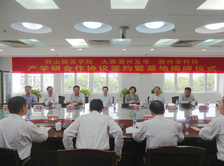 4月29日上午,韩山师范学院、广东大唐国际潮州发电有限公司(以下简称:大唐潮州发电公司)、潮州市科协“产学研”合作协议签约暨“产学研基地”揭牌仪式在大唐潮州发电公司举行,潮州市委常委、统战部部长徐和,韩山师范学院党委书记王晶,韩山师范学院党委副书记、纪委书记林光英,韩山师范学院副校长陈树思,大唐潮州发电公司总经理郭亚斌,大唐潮州发电公司纪委书记李国臣,大唐潮州发电公司副总经理王英华,市科协党组书记林峰、主席柯泓、副主席郑绍雄等出席仪式。徐和、王晶、郭亚斌、林峰为“产学研”基地揭牌。大唐潮州发电公司纪委书记李国臣主持仪式。
