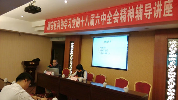 为深入学习贯彻党的十八届六中全会精神,全面提高科协系统广大党员干部的党性修养,2017年1月6日,潮州市潮安区科协邀请区委党校庄礼东副校长作学习党的十八届六中全会精神的辅导讲座。区科协六届委员会委员、各镇(场)科协负责人、区级各协会会长和秘书长、区级科普示范基地负责人、区全国(省、市)科普示范社区负责人、区科协机关全体同志参加讲座