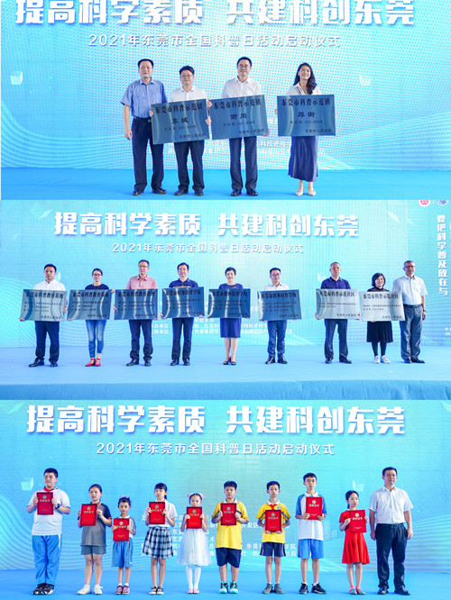 (颁发“我是科学小达人”奖状和“东莞市科普示范社区”“东莞市创客培育学校”“东莞市科普教育基地”“东莞市科普示范镇”等荣誉)