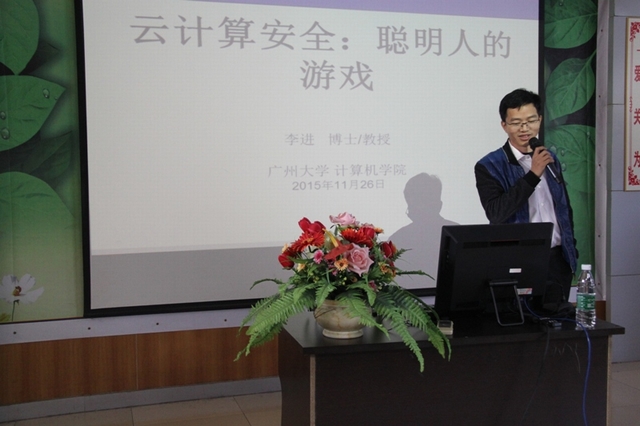 11月26日下午,广州科普大讲坛第108讲在广州彭加木纪念中学科技节嘉年华主会场开讲,讲坛以“云计算安全:聪明人的游戏”为主题,邀请了广州大学计算机与软件学院院长助理李进教授为现场200多名中学师生做科普报告。