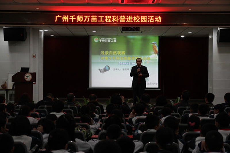 2015年12月30日,广州市青少年科技中心、市自然观察协会、荔湾区科协、西关实验小学共同举办“千师万苗工程科普进校园”活动。活动邀请市自然观察协会名誉会长曾庆平为学生进行了观鸟知识讲座,他用生动有趣的语言,为学生普及了鸟类的有关知识,宣传了爱护鸟类的重要性,呼吁大家一起来爱护我们的大自然,维持地球的生态平衡,在学生中引起了很大的反响。在讲座后,学生饶有趣味地参加了各项科技活动,并在动手活动中学到了与天气相关的科学知识,也明白了爱护环境的重要性。
