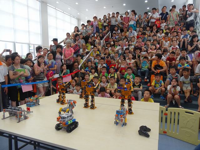二楼的科普馆则继续上演机器人狂欢。5台人形机器人排成方阵,演绎完整版的《新少图之光》,动作精准,惟妙惟肖;scratch软件机器人互动游戏则发挥孩子们的思维小宇宙,用带传感器的积木搭成机器人,融入游戏角色进行人机互动;另外还有猜拳机器人、分拣机器人、魔方机器人等,让孩子通过游戏了解机器人构造和原理,在这“六一”过足了机器人的瘾,陪孩子进行了一场脑力与思维的狂欢。