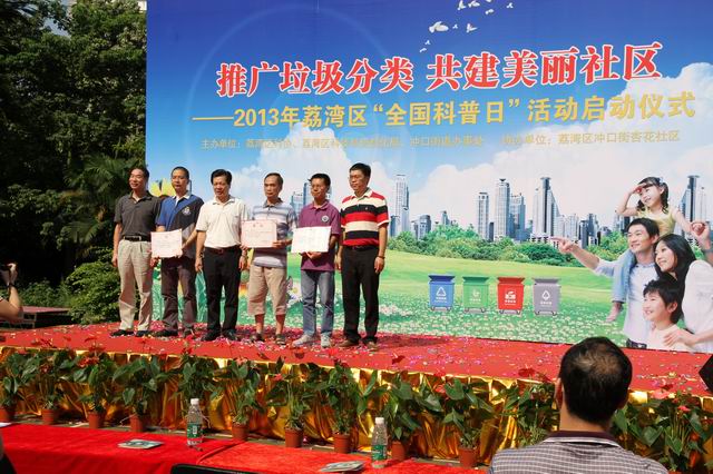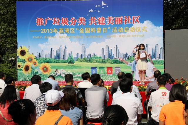 9月18日上午,广州市荔湾区2013年全国科普日活动在古建筑保护群聚龙村畔的科普文体广场正式启动。今年的荔湾区全国科普日活动主题是:推广垃圾分类,共建美丽社区。中共荔湾区委常委、区委组织部长毕锐明出席了启动仪式。科普志愿者代表、科普作品大赛获奖者及社区居民代表共150余人参加了活动。
