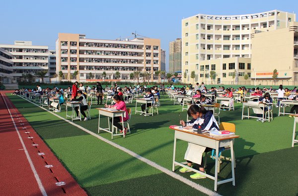 书法大赛在实验中学大操场摆上100张桌子,有100名由各班预选出的优秀选手参加,用毛笔书写科学名言警句等内容。本届大赛邀请河源市书法家协会的书法家为评委。评委对学生书法作品按楷书、隶书进行评奖,共评选出一等奖8名,二等奖12名,三等奖16名,优秀奖20名。