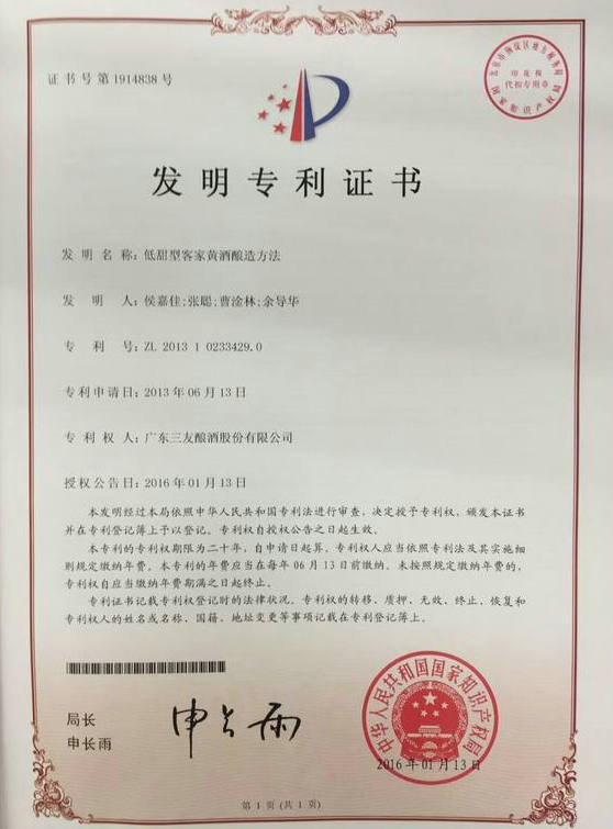 1月13日,河源市广东三友酿酒股份有限公司“低甜型客家黄酒酿造方法”被中华人民共和国国家知识产权局正式授予国家发明专利(ZL 2013 0233429.0),这一成果的取得,凝聚了公司科技人员的集体智慧。在三友集团科协的支持下,公司科技人员结合现代生物科技,经过多年的苦心研发、攻坚克难,传承创新出了中国客家黄酒的一个新品种:低糖型客家黄酒——龙乡贡·干黄酒。值得一提的是龙乡贡·甜黄酒传统酿造工艺入选了广东省第五批非物质文化遗产名录。