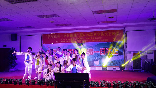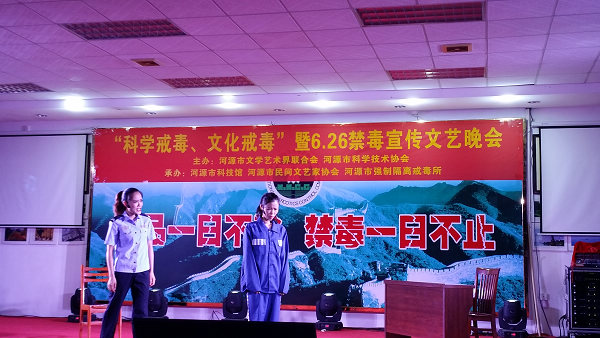 为深入贯彻落实党的十八大精神,推进社会主义核心价值观宣传工作,进一步加强禁毒宣传教育,丰富在所戒毒学员的精神生活,在第29个国际禁毒日来临之际,6月23日晚,河源市科技馆与河源市民间文艺家协会、河源市强制隔离戒毒所共同承办了,由河源市文学艺术界联合会、河源市科学技术协会主办的,在河源市强制隔离戒毒所举办的“科学戒毒、文化戒毒”“6.26”文艺联欢晚会。