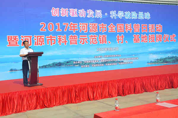 9月19日,由河源市科协主办,市高新区管委会、源城区科协、河源市弘霞客科技研究院承办的“2017年河源市全国科普日活动暨河源市科普示范镇、村、基地授牌仪式”在河源市高新区举行。启动仪式由市科协党组成员、副调研员成美清同志主持。市委常委、副市长,深河指挥部总指挥、市高新区党工委书记王卫同志,市高新区党工委副书记、管委会主任孙锋同志,市科协党组书记、副主席陈春林同志,市委副秘书长、深河指挥部办公室主任姚首强同志,各县区科协主席,被授予2017—2021年科普示范单位的代表,河职院科普志愿者共200多人参加启动仪式。