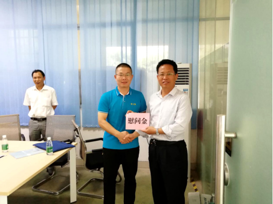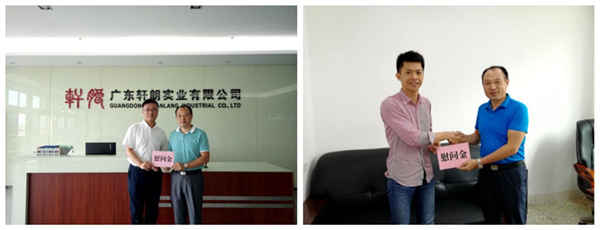 市科协副调研员辛小龙到广东轩朗实业有限公司慰问华路(左),在市科协会见、慰问高芳亮(右)
