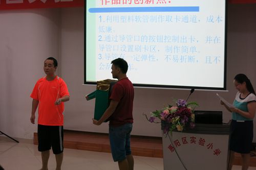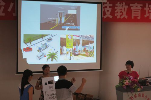 在教师实训中,老师们分为14个小组,各自围绕如何解决公路或停车场收费站自动取(刷)卡不方便的问题,团队完成简要论文和制作展示课件。短短1天里,各组老师齐心协力,集思广益,从提出不同的研究方向、确定研究内容和过程,到撰写论文、准备PPT,都凝聚着老师团队的智慧和力量。27日下午,各小组轮翻上阵,PPT讲解和作品演示相结合,通过人物动作表演,将作品研究背景、研究过程和作品特点一一展示。老师们形象生动、风趣搞笑的讲解演示与专家们一针见血、严肃幽默的精辟点评完美结合,现场笑声不断,高潮迭起。最后,综合专家评委和学员评委的打分,评选出前三名优秀团队并给予奖励。