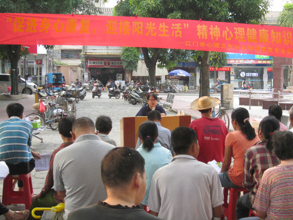 江门市心理卫生协会为提高民众精神卫生知识的知晓率,减低民众对精神疾病患者的歧视,于10月22日下午在新会区崖门镇举行“促进身心健康,迎接阳光生活”心理健康宣传系列活动。这也是今年纪念世界精神卫生日重要活动之一。活动邀请了江门市第三人民医院陈宝嫦医师和新会区三院张振文医师授课,崖门镇社区精神疾病康复者以及家属80多人参加咨询和义诊服务。