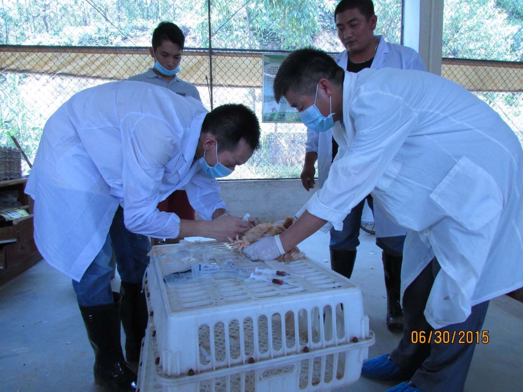 培训班分理论课和实操练习两个阶段进行,在理论课上,冯开容高级畜牧兽医师重点讲解了鸡翅内静脉采血、小鸡心脏采血、大鸡心脏采血、卧式猪前腔静脉采血、立式猪前腔静脉采血等技术以及样品采集的注意事项。在实操上,由曹建伟、邓志行、李万荣、汪海涛等全程现场指导。