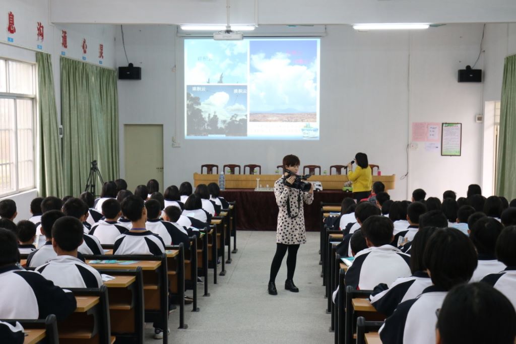 图为气象专业人员在学校举办气象知识讲座
