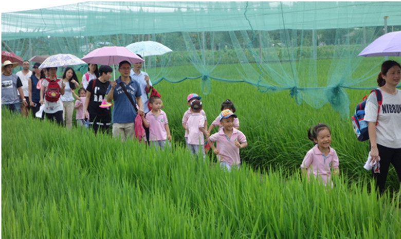 尽管艳阳高照,儿童们依然兴趣盎然,开心的跟着父母,在基地农科人员的指引下,参观蔬菜种植区,许多小朋友第一次看到种在田里的玉米,挂在藤架上未采摘绿油油的瓜果,兴奋地在田间跑来跑去。在水稻田边,农科人员带小朋友们观察正在抽穗扬花的水稻植株,当得知平时吃的米饭,都是在眼前顶着小穗绿油油的水稻收获后加工得来时,都很认真的点点头。田间儿童们笑声阵阵,生机勃勃的农作物映衬着孩子们如花的笑脸。