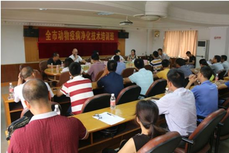 江门市畜牧兽医学会按照《广东省中长期动物疫病防治规划(2012-2020年)》,积极推进种畜禽重点动物疫病净化工作,于7月19日下午在市农业局,联合市畜牧兽医局、市动物疫病预防控制中心举办全市动物疫病净化技术培训班。邀请省动物卫生监督总所陈平洁博士为参加培训的50多名基层单位动物疫病净化工作负责人作培训演讲。市畜牧兽医学会关建新研究员主持培训班。