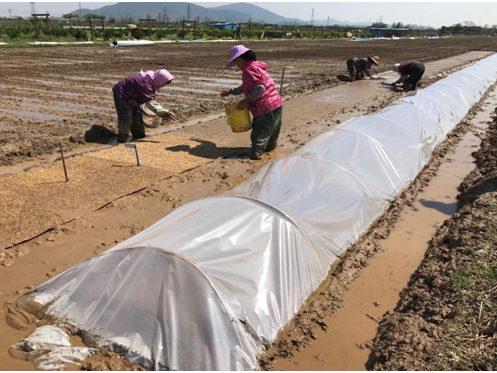 图为农户们进行水稻播种