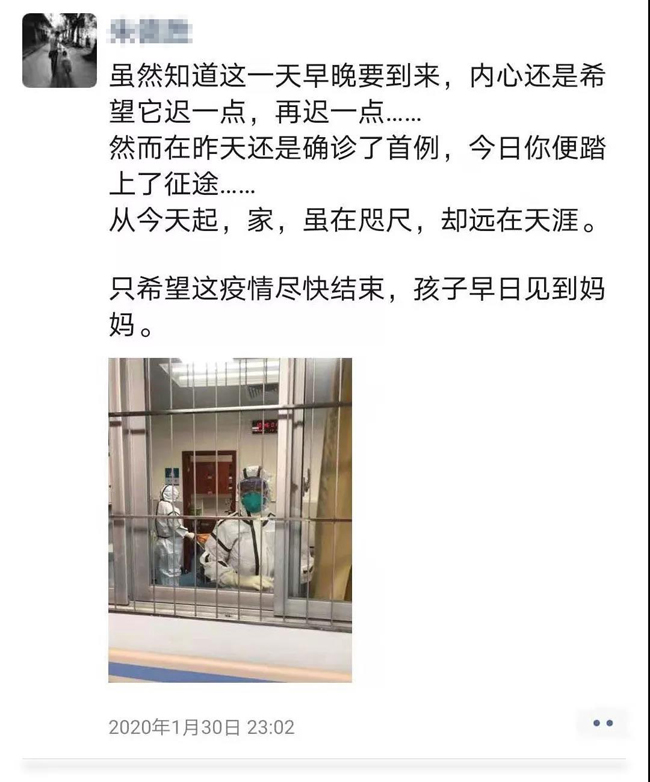 宋医生的老公发了个煽情的朋友圈,说到虽然知道这一天早晚要到来,内心还是希望它迟一点,再迟一点……然而在昨天还是确诊了首例,今日你便踏上了征途……