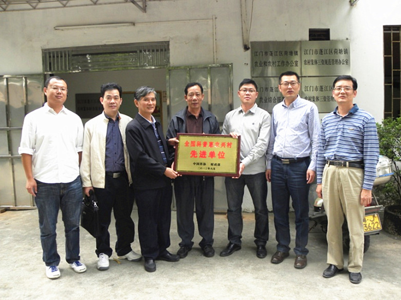 江门市政协副主席、市科协主席赵树培率领市科协科普部工作人员在蓬江区科协主席雷梓超主席等领导的陪同下,于11月21日上午,前往蓬江区荷塘镇冲菜加工协会开展科普惠农调研工作,与荷塘镇农业办公室和镇冲菜加工协会等负责人一起座谈,并向他们颁发了“2013年全国科普惠农兴村先进单位”的牌匾。