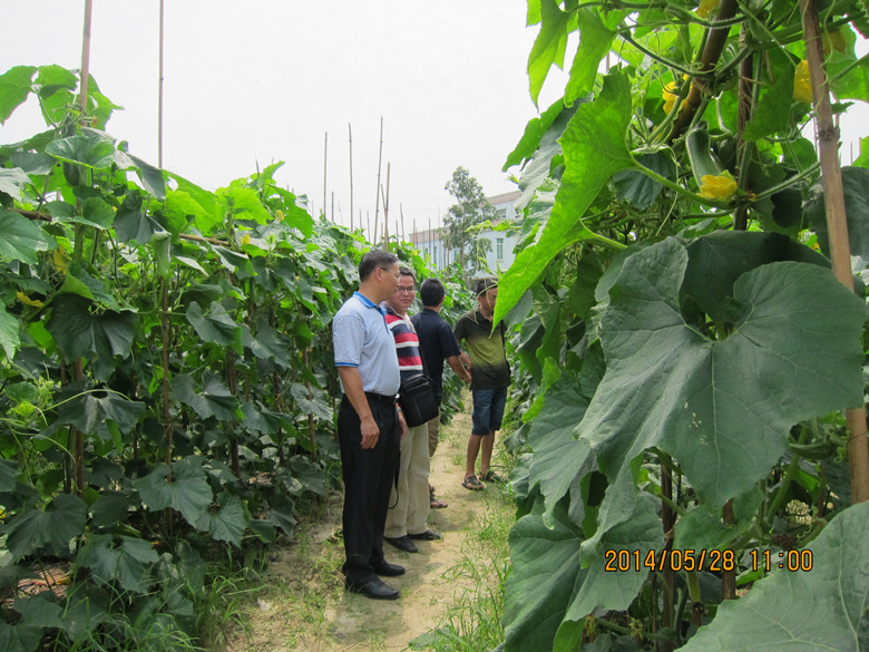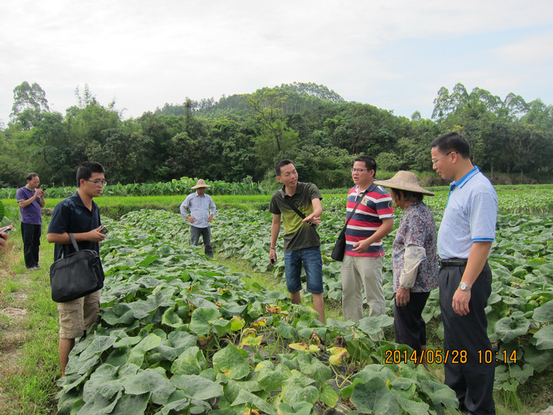 当日上午,市农学会的专家在鹤山市宅梧镇农办负责人的陪同下,来到选田村和下沙村种植南瓜、节瓜和苦瓜等农作物的农田,向田间劳动的农民详细了解种植的品种、种植时间以及收成情况,现场为农民解决他们在生产中遇到的问题。经仔细观察各品种种植表现出的田间性状,向农民提出在当前高温高湿的天气情况下要注意及时排水,并做好病虫害防治工作,使用高效低毒农药。