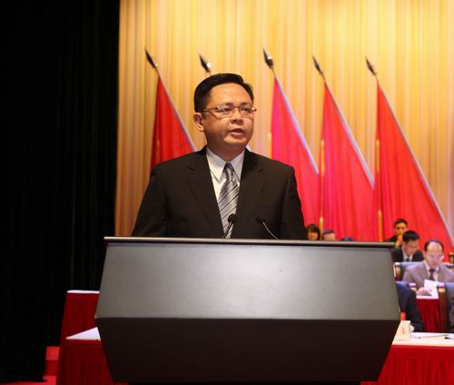 茂名市总工会常务副主席黄家进代表市人民团体在会上致辞