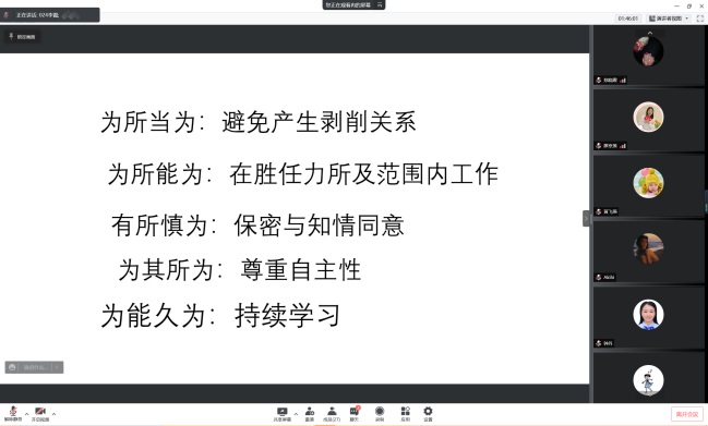 在回应老师们提问的热线中可能遇到的挑战情景时,例如沉默的来电,重复的来电,情绪激烈的来电等,李霞提到遵守专业伦理是保障心理工作者和援助对象权益及福祉的前提,也是一切心理工作的基本要求。李霞强调心理援助热线志愿服务队在遵守善行、责任、诚信、公正、尊重的伦理总原则上,具体到心理援助实务中,还应做到以下五点:一是为所当为,避免产生剥削关系。这要求心理援助热线志愿者在工作中不能做出损害援助对象权益的行为,应充分尊重援助对象的需要。二是为所能为,在胜任力所能及范围内工作。这要求心理援助热线志愿者在工作中一旦意识到出现了自身能力难以应对的情况,应及时寻求专业的督导或进行转介,并坦诚向对方说明情况。三是有所慎为,做好保密与知情同意。这要求心理援助热线志愿者在工作中应谨慎对待涉及保密与知情同意的问题。四是为其所为,尊重援助对象的自主性。五是为能久为,保持持续学习,为自己专业助人工作保驾护航。
