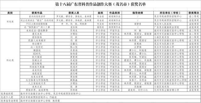 近日,第十八届广东省科普创作大赛获奖结果揭晓,茂名市在本届赛事中获得省二等奖4项、省三等奖1项、省优秀奖18项。高州市石鼓镇石鼓中心学校、茂名市疾病预防控制中心荣获本届赛事优秀组织奖。