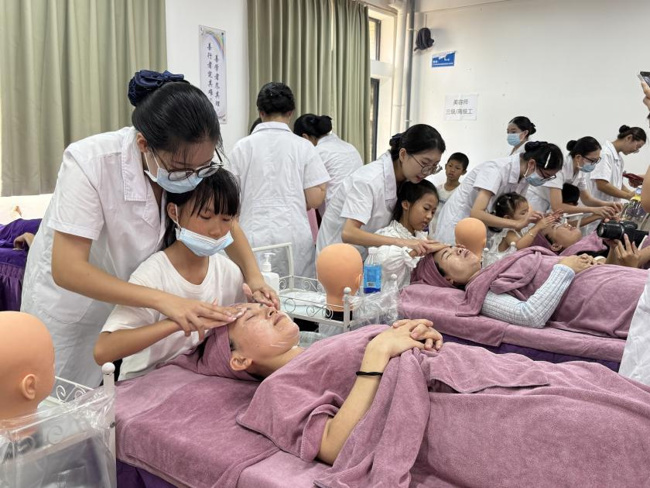 活动开始,学院专业教师通过精美的皮肤结构模型,为亲子家庭生动讲解表皮层、角质层的功能特性,以及紫外线对皮肤的影响。通俗易懂的科普讲解配合直观的模型演示,使复杂的皮肤科学知识变得简单有趣,帮助每个家庭建立起科学的护肤观念。