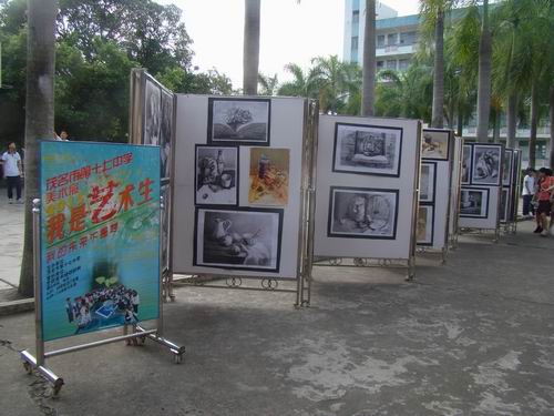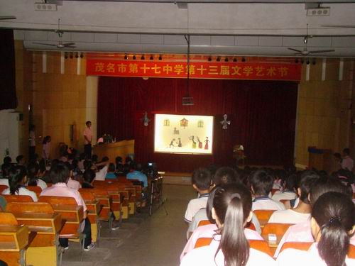 茂名市第十七中学非常注重传承和发展皮影戏,该校成立了皮影社团,组织学生创作并进行表演,很受学生们的欢迎。2013年,该校的《走进皮影戏》科技实践活动获得第28届广东省青少年科技创新大赛科技实践活动一等奖,并被推荐代表省参加今年8月份在南京举行的全国青少年科技创新大赛。活动当天还现场表演的《孔雀东南飞》、《灰姑娘》这两场皮影戏,是由学生们自己改编、创作、现场表演的,剧情跌宕起伏,语言诙谐生动,人物造型栩栩如生,学生们在后台齐心协力,操作道具,联袂配音演出,博得在场的嘉宾及师生们的热烈掌声。此外,在文学艺术节期间,该校还举办了美术展,展出一批优秀的学生绘画作品。