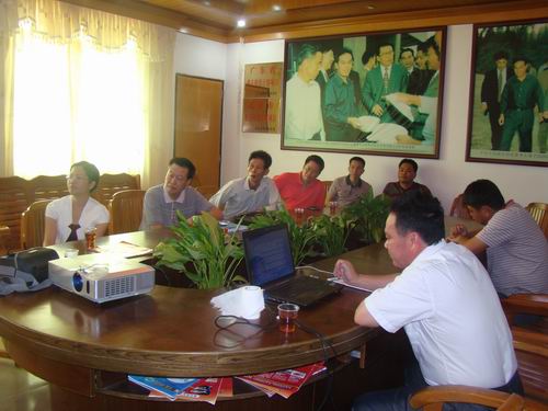 茂名市科协主席朱建雄(左二)听取公司“院士专家企业工作站”建设工作汇报