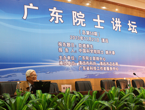 11月21日,广东院士讲坛(第58期)活动在清远市举行,著名的肿瘤病理生理学家、中国科学院院士姚开泰教授应邀做客讲坛作“防癌养生”专题报告。