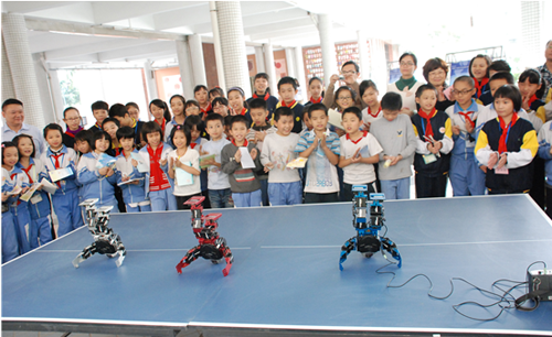 在举行科普资源共建共享基地揭牌仪式的同时,佛山市科协和禅城区科协还组织了科普大篷车进校园活动,满载科学知识的科普大篷车,为南庄镇中心小学的师生带来了“失真的图像”、“设计组装自行车”、“梵天塔”、“益智玩具”等30多种科教展品,充分展示了光学、计算机学、数学等方面的科学原理,还有3D电影体验、机器人表演、《科技新生活》科普展板。同学们兴致勃勃、争先恐后地观看了解展品的原理,并亲自动手实践操作。通过活动,给予了师生们走近科学、认识科学、了解科学的良好机会,让师生们真正颔悟和感受到了学好各门科学知识的重要性和必要性,真正认识到了各种知识在科普设备中的正确运用,达到了面向少年儿童推广科技知识的真正目的和实际效果,在全校范围营造了一个良好的科技教育与学习氛围。