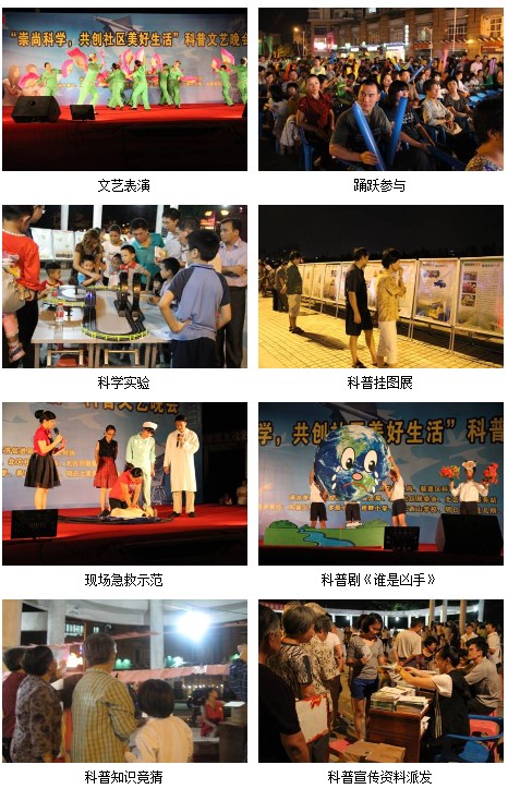 晚会现场,灯火通明,人山人海,热闹非凡,科普大篷车、科普知识咨询、科普有奖竞答、科普小册子派发、大型科普挂图展、文艺表演等精彩活动接连上演,吸引了到场观众的眼球,晚会气氛高潮一浪接一浪。此次“科普大篷车”带来了科普实物展品涉及到光学、电磁学、物理学等多个学科知识,令在场观众耳目一新。文艺表演涵括了《文韬武略诸葛亮》、《谁是凶手》等科普节目,赢得现场掌声不断。晚会中穿插的科普知识问答同样受到市民热捧,男女老少踊跃抢答。