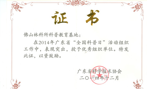 佛山市林科所在2014年“全国科普日”活动中表现突出,2014年12月,广东省科协授予佛山市林科所“优秀组织单位”荣誉称号。