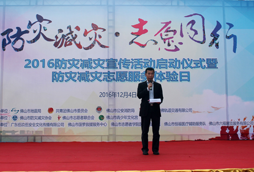 2016年12月4日上午,由佛山市地震局、共青团佛山市委员会、佛山市公安消防局、广东广佛轨道交通有限公司、佛山市防灾减灾协会、佛山市志愿者联合会、佛山市青少年文化宫联合承办的“防灾减灾•志愿同行”2016防灾减灾宣传活动启动仪式暨防灾减灾志愿服务体验日活动在佛山市铂顿城广场举行。