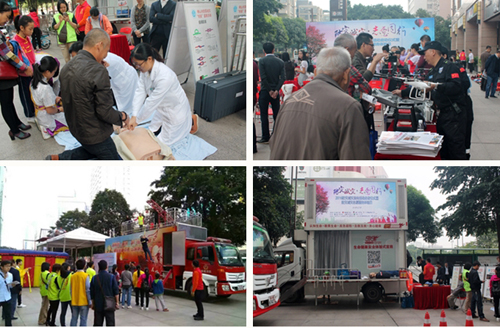 活动现场开设了多个服务体验区,包括消防逃生、医疗救护、志愿救援等。佛山市公安消防局展出大型消防车教市民学习应急高处逃生;佛山市中医院服务队的医护人员手把手教市民如何为病人进行心肺复苏和人工呼吸;佛山菠萝义工队向市民展示专业救援设备的使用方法;广东伍玖伍安全文化传播有限公司为市民提供应急模拟体验大篷车,体验地震、火灾等突发事件发生后如何逃生。现场还举办了青年志愿者联欢会,纷纷为市民展示武术表演、跆拳道表演、爵士啦啦操、个人吉他弹唱、诗文朗诵、太极表演以及花球啦啦操等演出。这次活动吸引了上千名市民到场参与,通过实物展示、互动交流、亲身体验的方式,让市民更深入的了解了防灾减灾工作,同时学习到相关的逃生自救的科普知识。