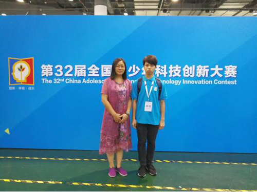2017年8月14-19日,李柱霖同学(右)和刘玉荣老师(左)参加第32届全国青少年科技创新大赛获得一等奖