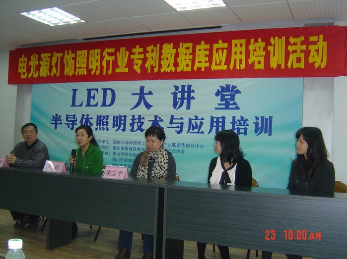 培训活动邀请国家知识产权局专利局文献部副处长朱跃进行专题讲解和具体操作指导。12月23日上午在南海电光源灯饰照明行业协会进行了“电光源灯饰照明行业专利数据库应用培训”,下午在佛山科学技术学院信息楼电脑室举办了“专利信息分析及数据库应用培训班”。