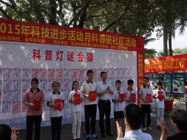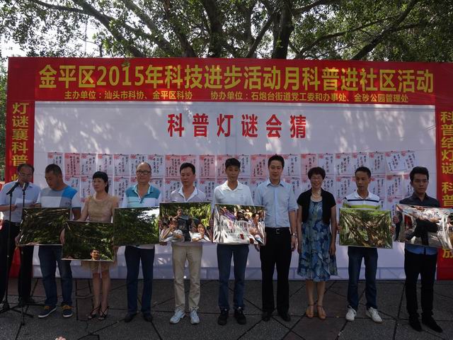 金平区区长林锡波、市科协主席洪建芬等领导为金平区科普示范社区、科技特色学校、区第八届青少年科技创新大赛获奖单位和个人进行授牌颁奖,鼓励学校和社区科普工作者继续加强科普教育宣传工作。金平区科协利用展板进行科普区第八届青少年科技创新大赛优秀作品展览,同时联合市科协、市地震局、区科技局、区人社局、区司法局、区卫计局、区妇联、区安监局、区总工会、环保金平分局、石炮台街道举办科技、文化、环保等贴近群众生活的宣传项目,向群众免费发放了防震减灾知识、食品安全、知识产权知识、优生优育、防灾减灾应急知识等科普资料,并热情耐心地为群众解答科技、防震减灾、食品安全、法律等方面的咨询。