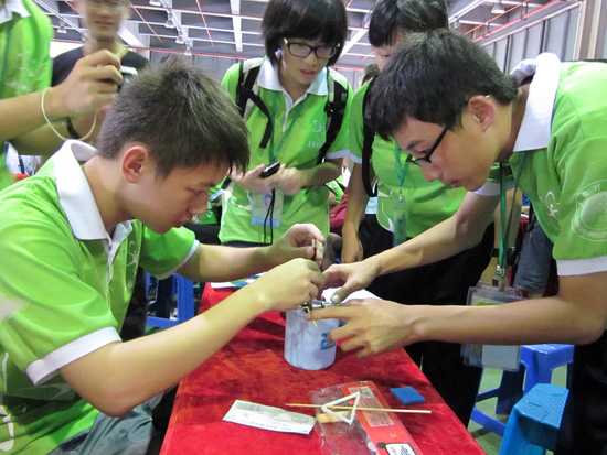除了趣味投石机,竞技赛还有一大热门,就是环保科普实验,考验知识运用的能力。这组实验由我带头,当然也要把这三个实验做好。当裁判宣布开始时,每个人都抓紧动手实践。第一个实验挺简单,利用光谱原理很轻松解决。第二个是关于离心运动的,通过提示中的信息构思模型,最终也和组员们一同破解。最难的是“旋转的铅笔”。根据运用立体模型的方法,我们进行了多次尝试,后来我掌握到了使铅笔立起来的诀窍,于是尝试修改。当铅笔忽然立起来时,我们激动不已。三个实验都成功了!