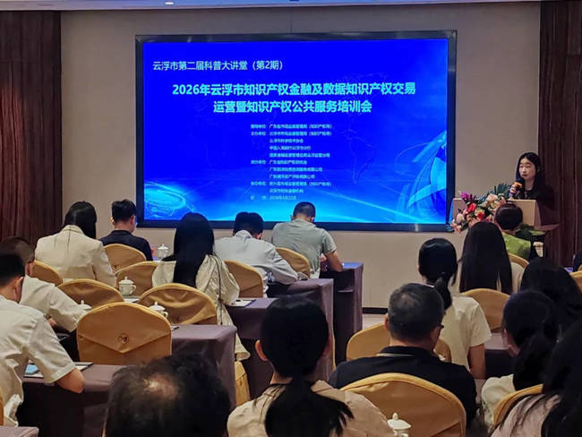 4月22日,云浮市第二届科普大讲堂(第2期)在新兴县举办。本次大讲堂以知识产权金融服务与公共服务为主题,同步融入2026年云浮市知识产权金融及数据知识产权交易运营、知识产权公共服务培训内容,助力企业提升知识产权运用与保护能力。