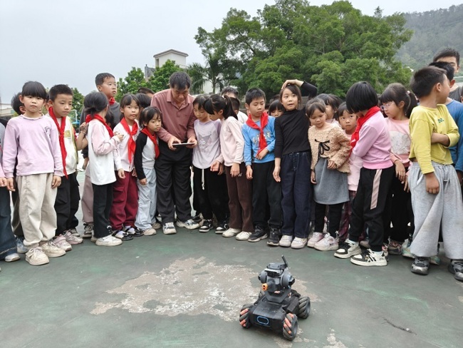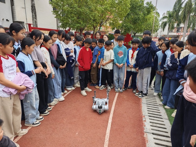 在智能机器人展示区,郁南县科协带来的“机器狗”成为全场焦点。它不仅憨态可掬、灵活行走,还能与同学们进行趣味互动,其精准的指令响应和拟人化的动作,让同学们直观感受到了人工智能的魅力与前沿科技的奇妙。