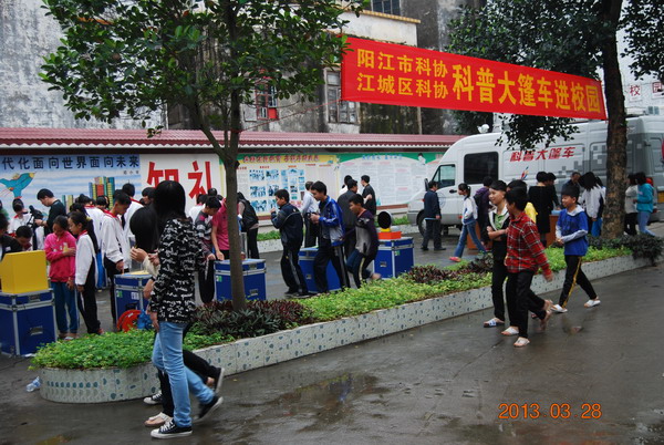 当天,阳江市科协的科普大篷车开到江城区白沙中学开展了“科普大篷车进校园活动”,600多名师生到现场观摩《身边科学》等20多幅科普宣传挂图、科普大篷车互动展品。活动旨在丰富学生们的科普知识,激发他们探索科学奥秘的兴趣。