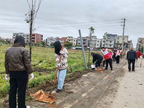 活动现场,党员干部们身着整齐的服装,志愿者们热情洋溢,村民代表们也干劲十足。在众人齐心协力之下,120棵香樟树苗扎根于村道两侧。这些新栽的树苗排列得整整齐齐,嫩绿的枝叶在微风中轻轻摇曳,为低垌村增添了无限盎然生机,仿佛是绿色的卫士,守护着这片乡村土地。