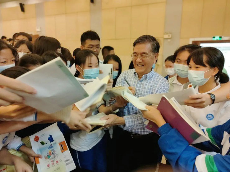 在讲座结束之际,学生们围绕在他身边,请教问题、请求签名留念。刘焕彬耐心热情地为孩子们解答疑问,认真签名。这位老科学家成功“圈粉”,激励孩子们立志成才,发奋读书,报效祖国。